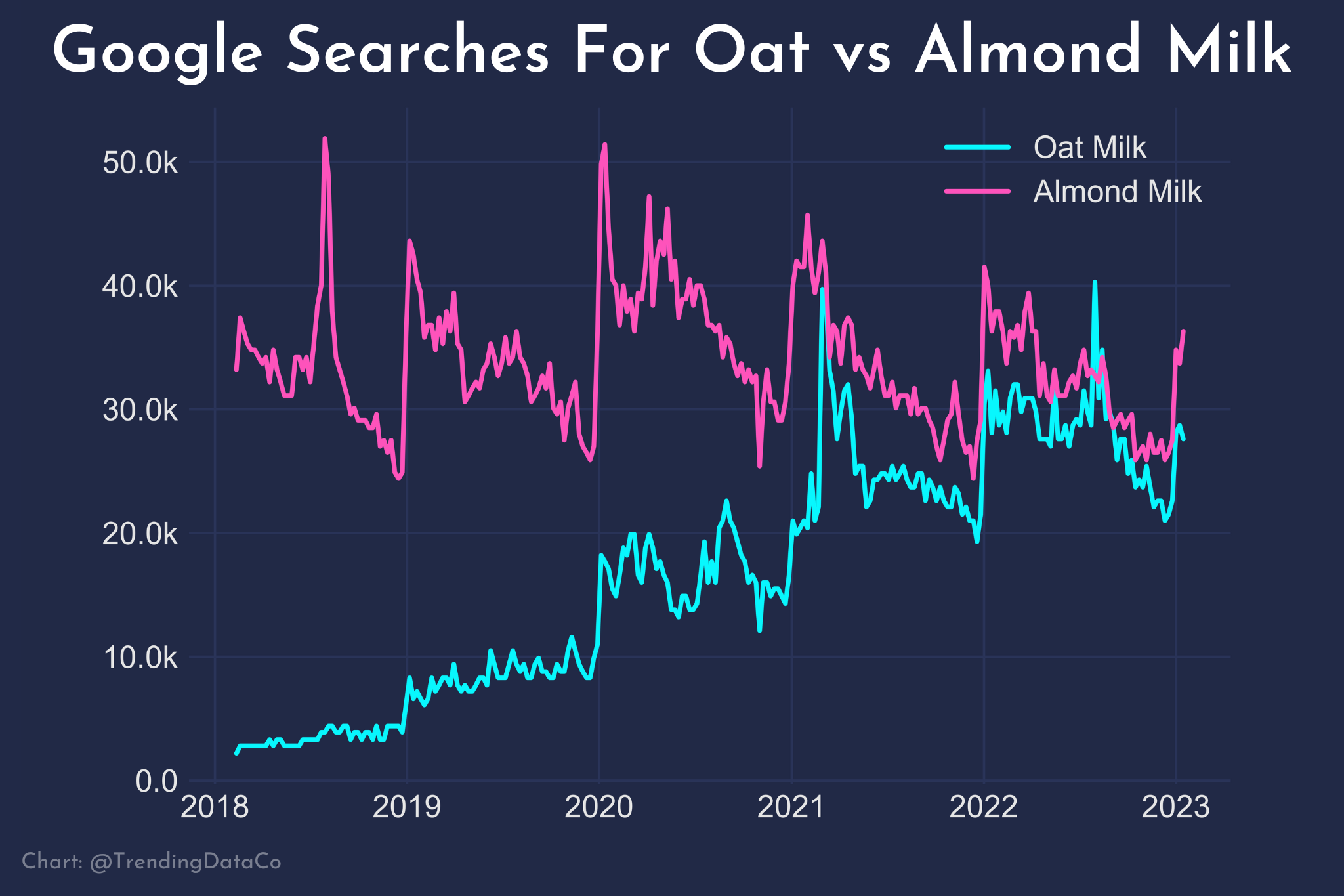 Sipping on the competition! Oat milk is quickly becoming a popular alternative to traditional dairy milk and is gaining on the once-raining almond milk!